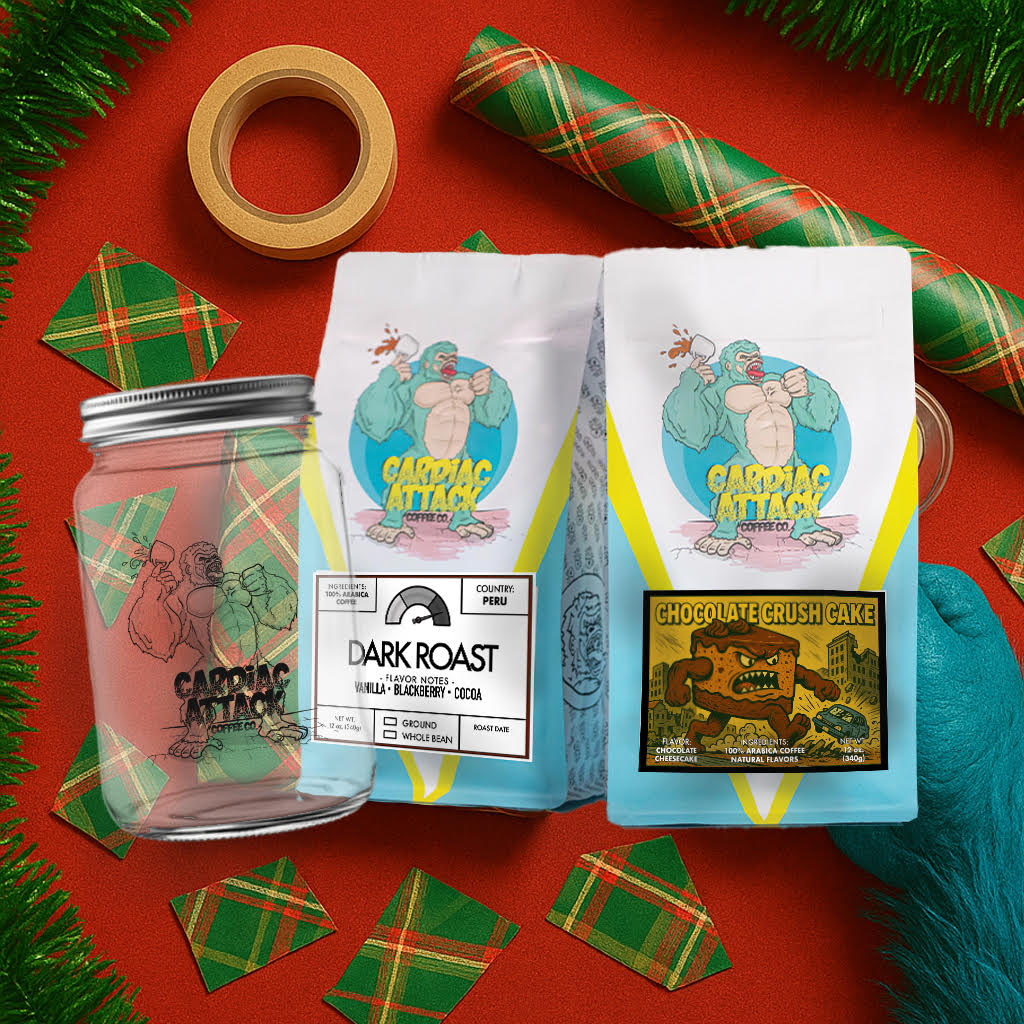 Chocolate Cheesecake Flavored Coffee, Dark Roast Peru & Our Branded Mason Jar Bundle available for the holidays. The perfect Christmas gift for your loved ones.